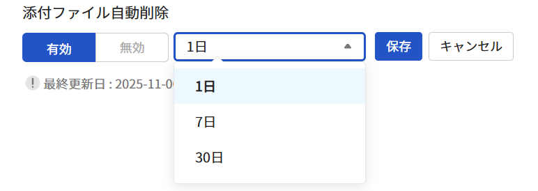 - 自動削除が有効な状態で受付されたチケットについて、チケットが「完了」となった日から設定された期間が経過すると、添付ファイルが自動的に削除されます。