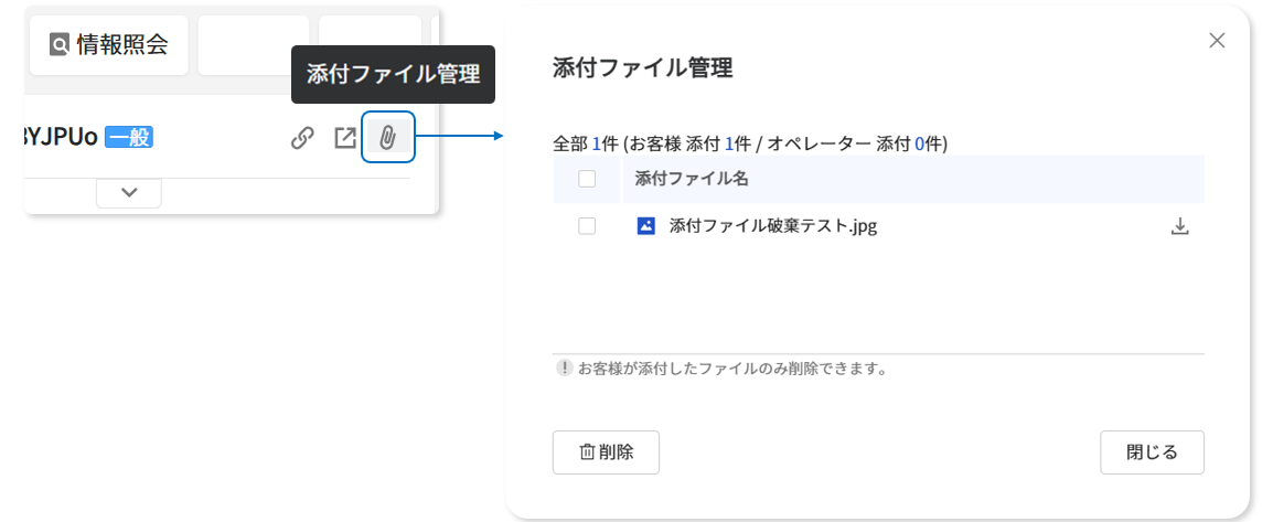 - チケット管理の「添付ファイル管理」機能にて、顧客アップロードファイルを個別に手動削除することができます。